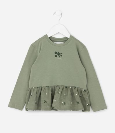 Blusa infantil confeccionada em algodão certificado BCI e meia malha macia. Possui gola redonda, mangas longas e recorte com barra em tecido floral fullprint levemente franzido. A estampa localizada no peito complementa o visual delicado e confortável para o uso diário.