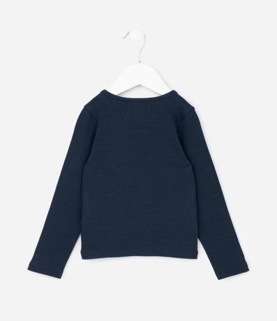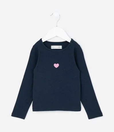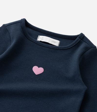 Ref: Blusa infantil modelo slim confeccionada em algodão certificado BCI e boas práticas ambientais. Possui gola redonda, mangas longas e superfície canelada em ribana, além de estampa localizada de coração no peito.