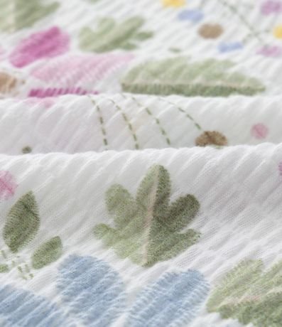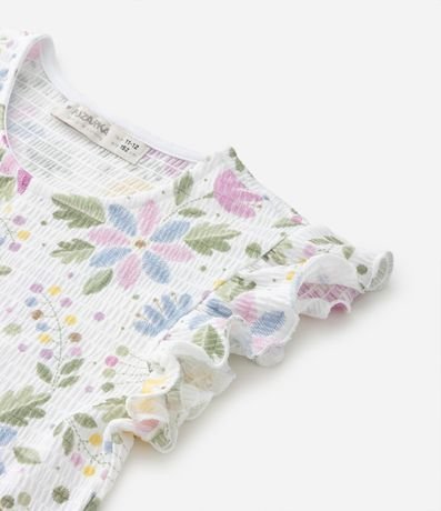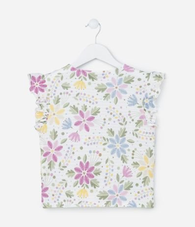 Ref: Blusa infantil texturizada, confeccionada em poliéster com elastano, com gola redonda e babados nos ombros. Possui estampa floral e amarração frontal com franzido.