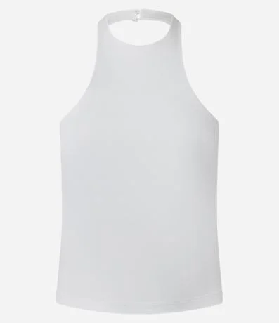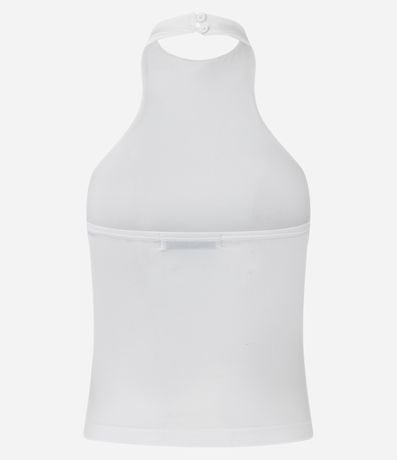 Blusa feminina confeccionada microfibra, sem estampa, sem mangas e com decote halter. Possui abotoamento no pescoço e franzidos laterais.