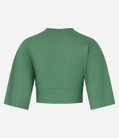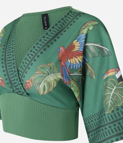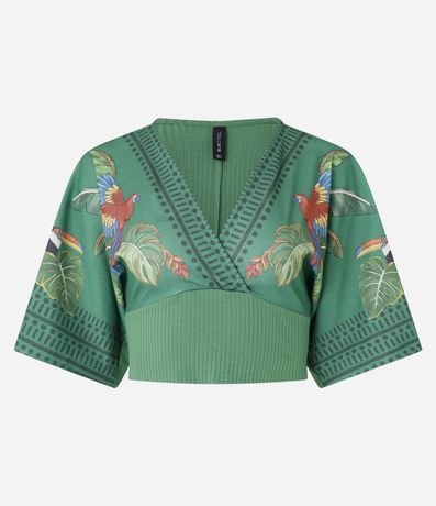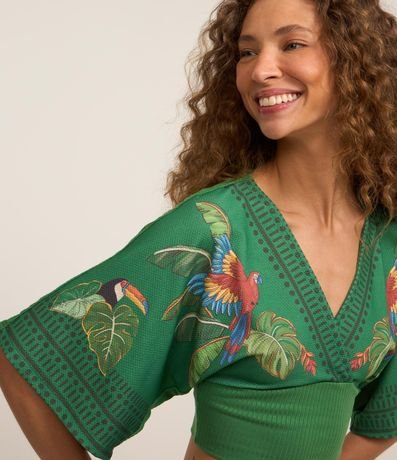 Ref: Blusa feminina estilo kimono com decote cruzado em V. A peça tem a barra e as costas em ribana lisa, enquanto a parte dianteira é estampada de araras e folhagens.