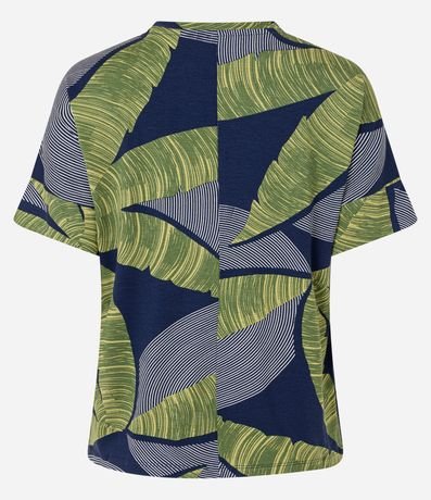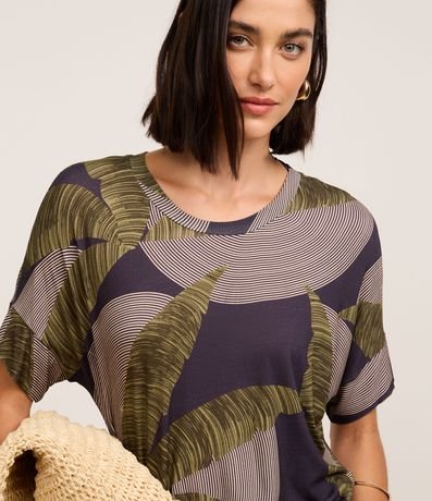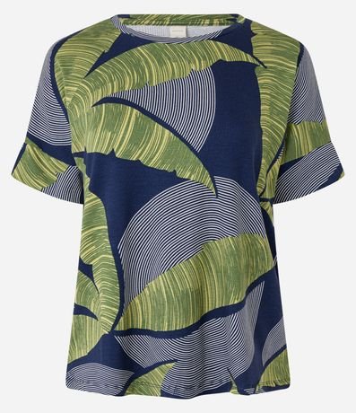 Ref: Blusa feminina confeccionada em malha de viscose mais responsável com elastano, com gola redonda e mangas curtas. Possui estampa de folhagens.