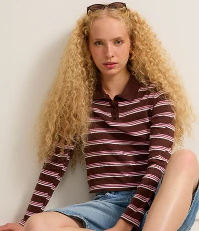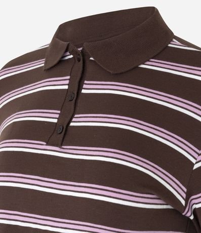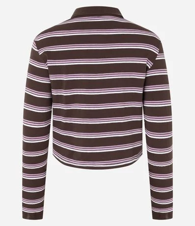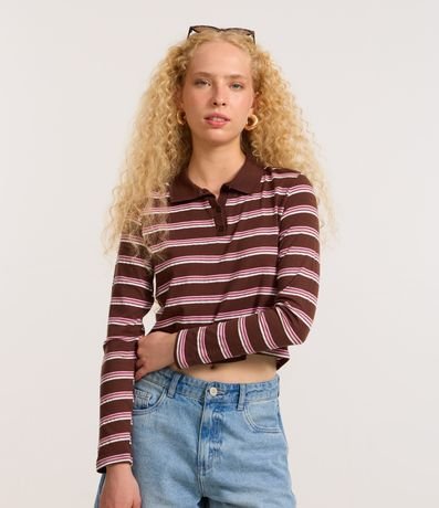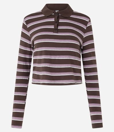 Blusa polo com listras contrastantes, botões no decote e manga longa.