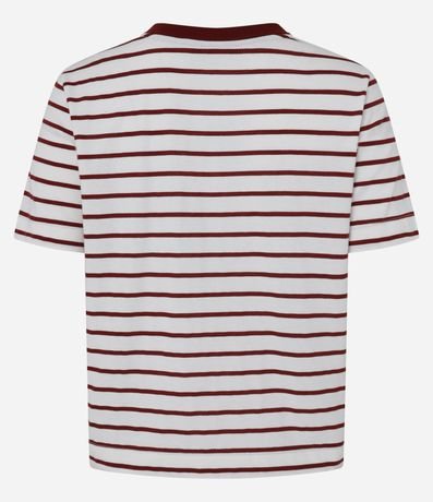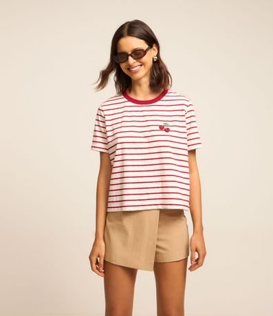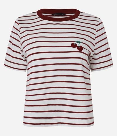 Ref: Blusa de mangas curtas confeccionada em algodão mais sustentável com gola redonda contrastante, listras horizontais e bordado de cereja em efeito crochê localizado no peito.