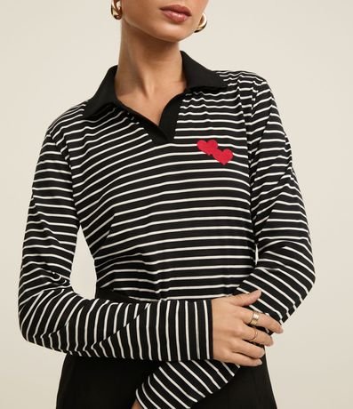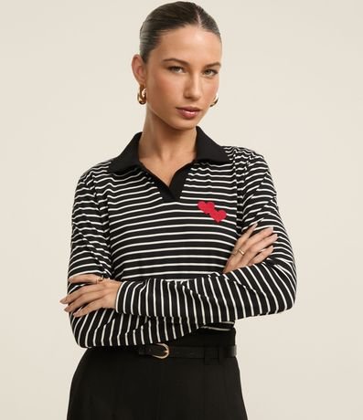 Blusa Listrada em Algodão com Gola Polo e Bordado Coração