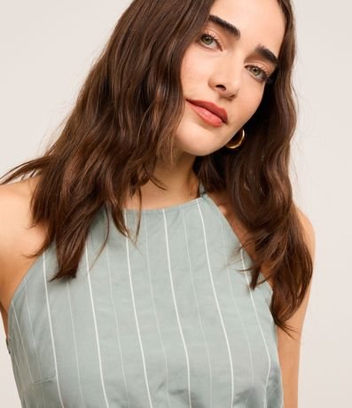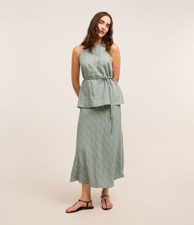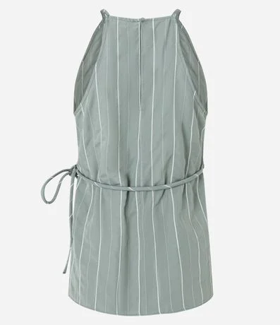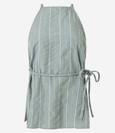 Ref: Blusa sem mangas, confeccionada em liocel com 20% de linho, com gola halter. Peça tem amarração na cintura, fendas nas laterais da barra, além de listras verticais. Fabricada através de boas práticas ambientais.