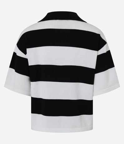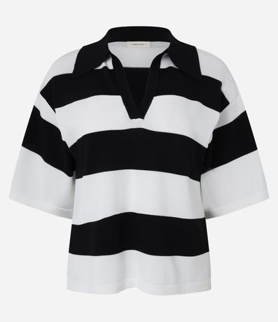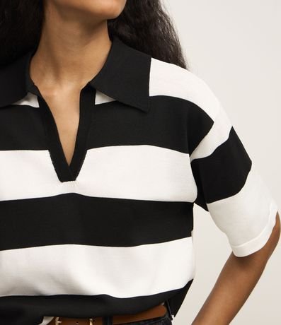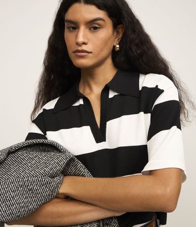 Blusa de mangas curtas com cavas deslocadas confeccionada em tricô com gola polo além de listras horizontais em blocos de cores.