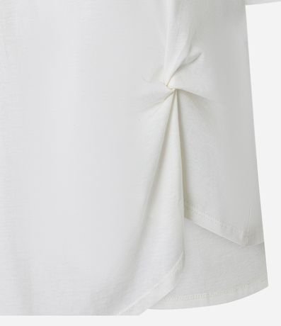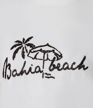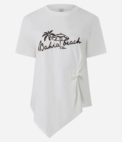 Blusa feminina confeccionada em algodão mais sustentável. Possui gola redonda, mangas curtas e barra assimétrica com torção lateral que valoriza o design. Apresenta estampa localizada com temática praia e lettering Bahia Beach, ideal para compor looks casuais modernos.