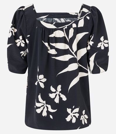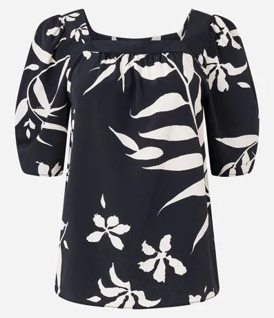 Blusa em crepe com decote quadrado, magas curtas bufantes e e folhagens estampadas.