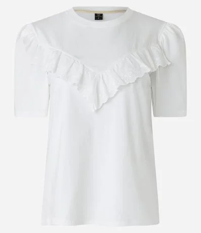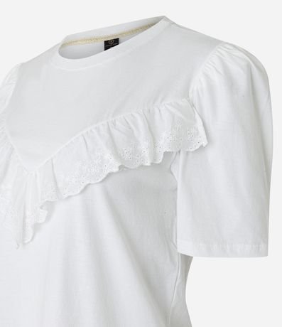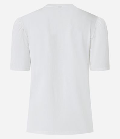 Ref: Blusa em meia malha com gola redonda, mangas curtas bufantes e recorte babados de renda em formato V no busto.