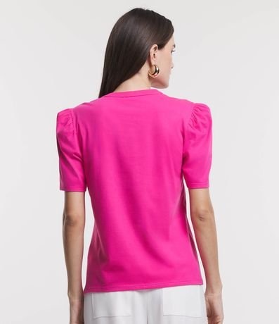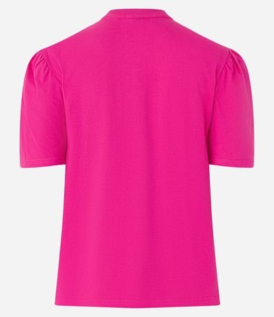 Blusa em meia malha com gola redonda, mangas curtas bufantes e recorte babados de renda em formato V no busto.