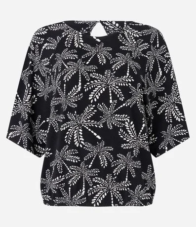 Ref: Blusa em viscose com decote canoa, abertura por gota, mangas curtas um pouco maiores que o comum. Conta com folhagens estampadas por toda a blusa.