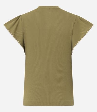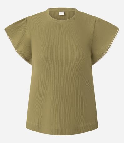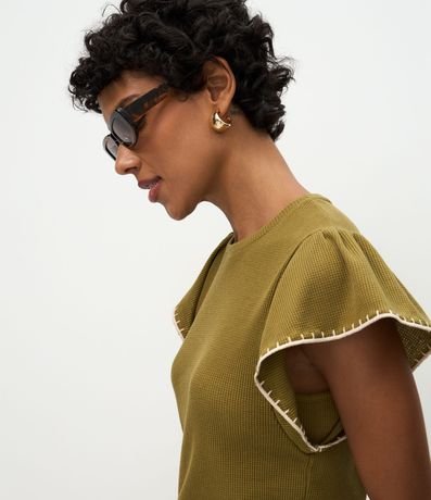 Ref: Blusa feminina em malha texturizada confeccionada em algodão certificado mais sustentável. Possui modelo com mangas curtas em formato de babado e acabamento bordado nas bordas, gola redonda e caimento reto.