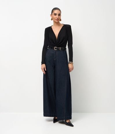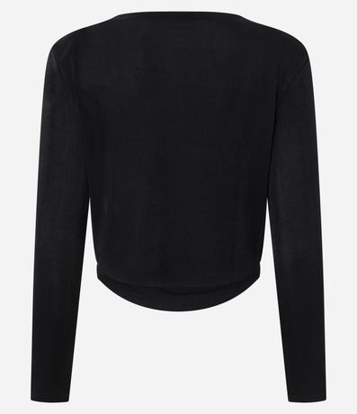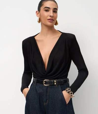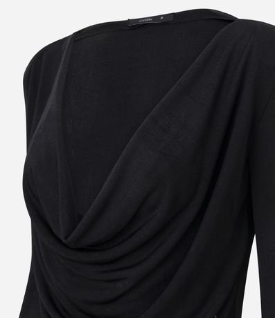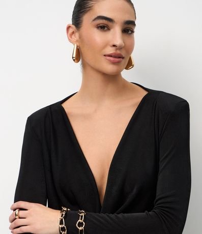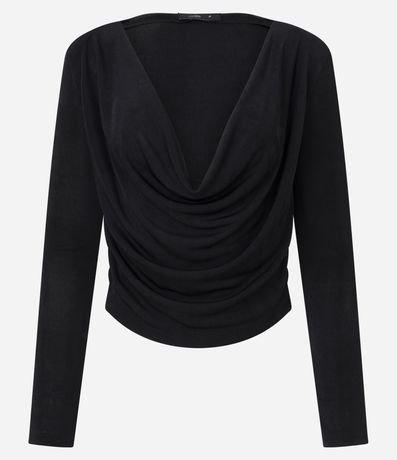 Ref: Blusa feminina de manga longa confeccionada poliéster. Possui decote degagê profundo com drapeados frontais, ombreiras estruturadas e acabamento canelado com leve brilho. Modelagem mais curta nas costas, trazendo caimento moderno e elegante para compor looks versáteis.
