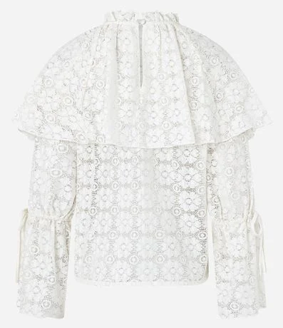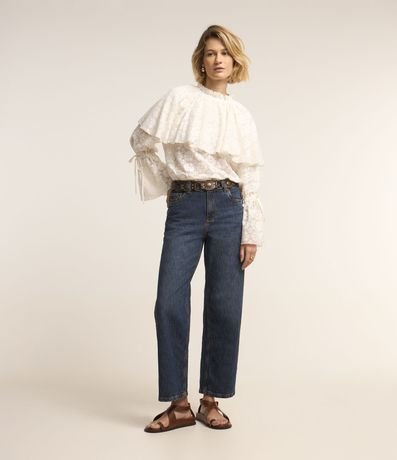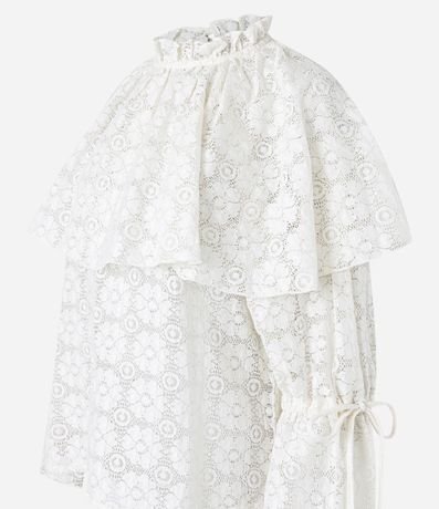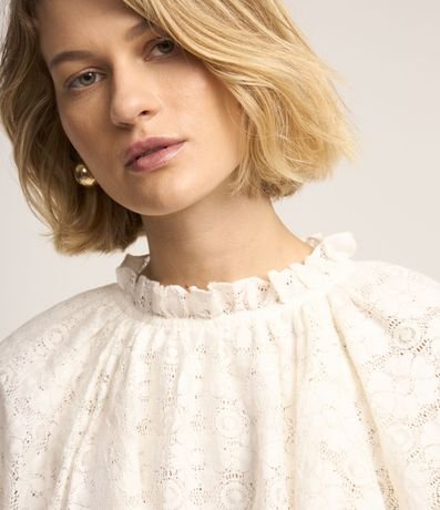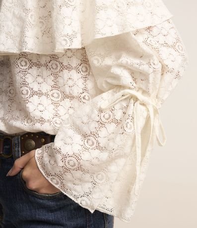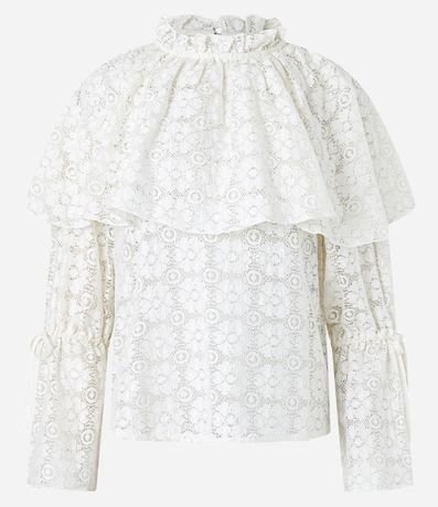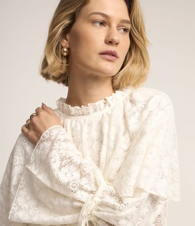 Ref: Blusa manga longa em laise com bordado floral, babado no decote e nas mangas. Possui amarração nos punhos.