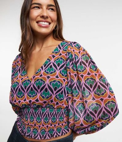 Blusa confeccionada em tule com decote V e mangas longas com elásticos nos punhos além de franzidinhos e lastex na barra. Possui estampa abstrata com uma vibe psicodélica/hippie.
