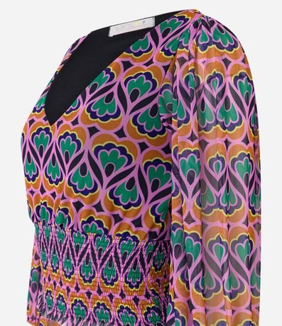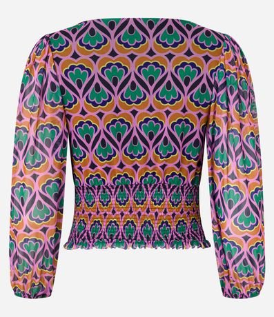 Blusa Manga Longa em Tule com Lastex e Estampa Abstrata