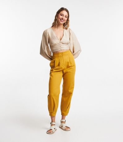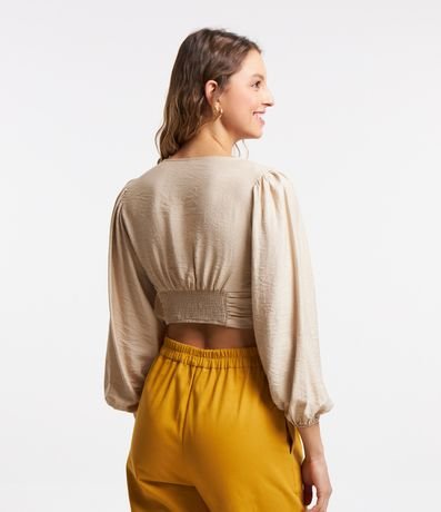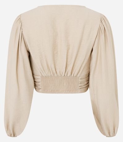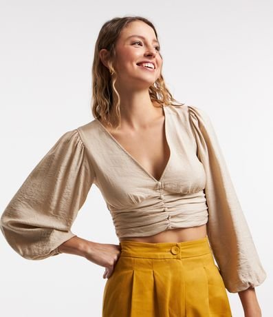 Ref: Blusa confeccionada em viscose com decote V e mangas longas. Conta com botões aplicados na parte frontal além de franzidos na região mais próxima da barra.