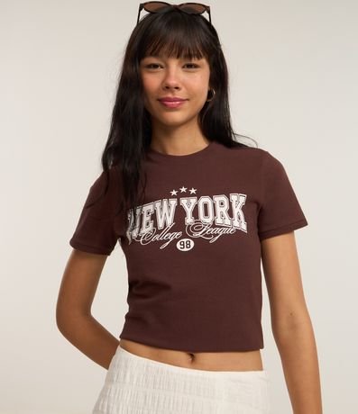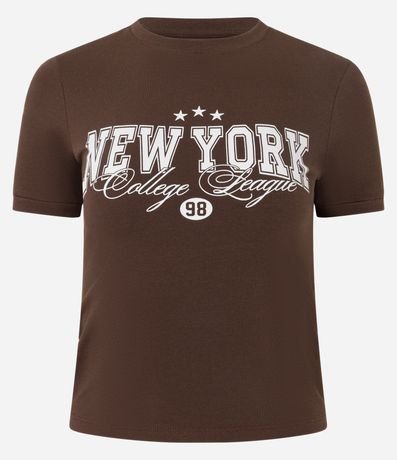 Ref: Camiseta feminina de modelo new t-shirt confeccionada em algodão mais responsável, com gola redonda e mangas curtas. Possui estampa frontal de tema college com lettering "New York college league 98".