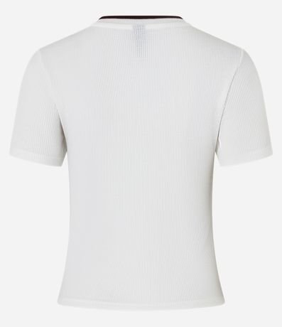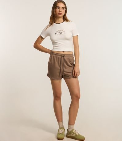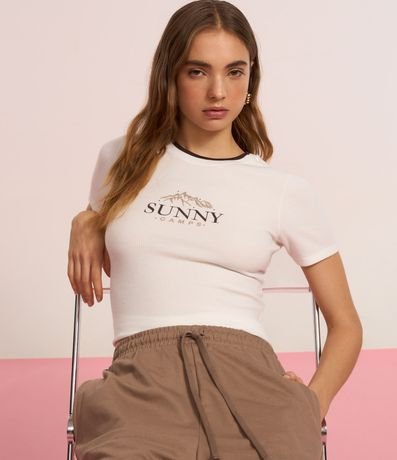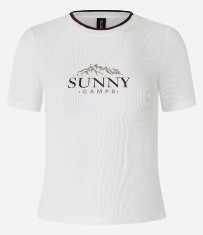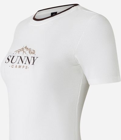 Ref: Blusa new t-shirt feminina texturizada, com gola redonda contrastante e mangas curtas. Possui estampa lettering "Sunny Camps" na parte frontal.