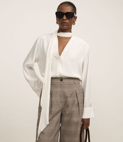 Blusa manga longa com textura acetinada, decote v e gola laço no pescoço.