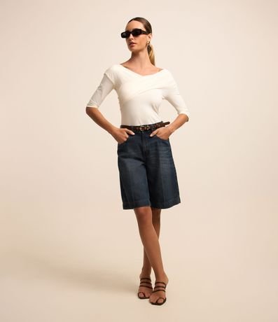 Blusa ombro a ombro feminina, confeccionada em poliamida, com mangas 3/4 e detalhe transpassado no decote.