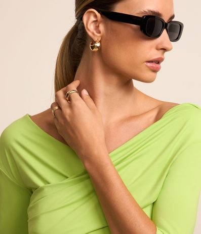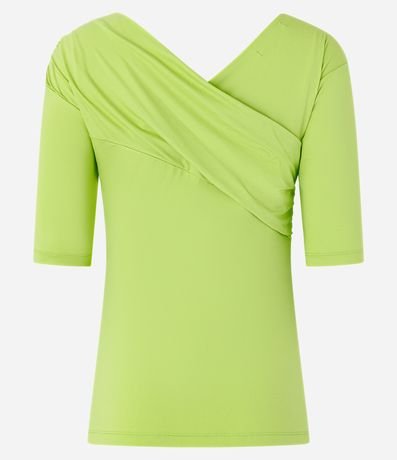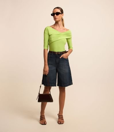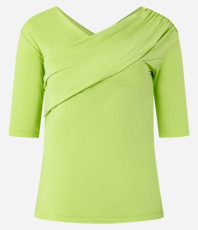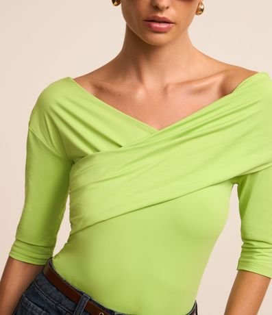 Blusa ombro a ombro feminina, confeccionada em poliamida, com mangas 3/4 e detalhe transpassado no decote.