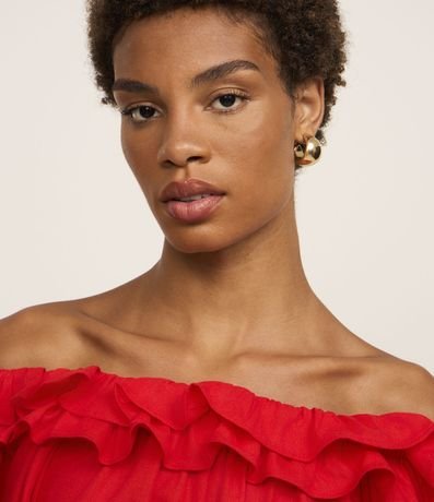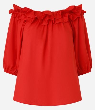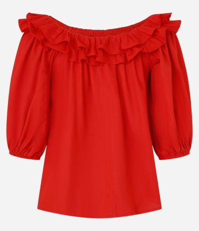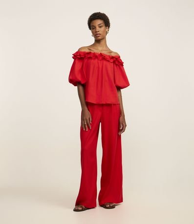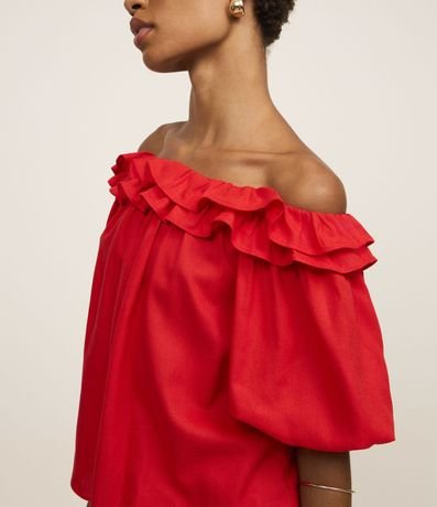 Ref: Blusa feminina confeccionada com linho e viscose mais sustentável, sem estampa. A peça tem decote reto ombro a ombro com babados e mangas curtas amplas com elástico.