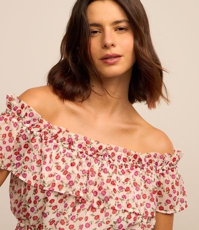 Ref: Blusa ombro a ombro feminina, confeccionada em crepe, com elástico na cintura e babado na barra. A peça também conta com estampa mini floral.