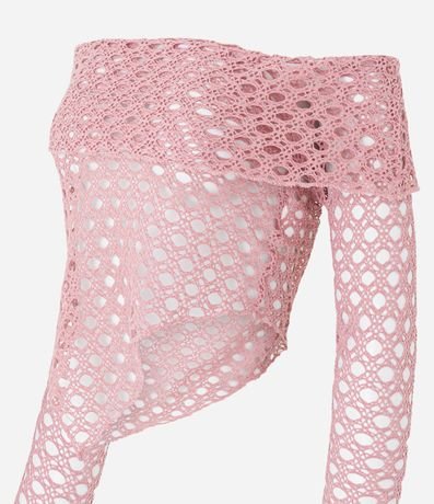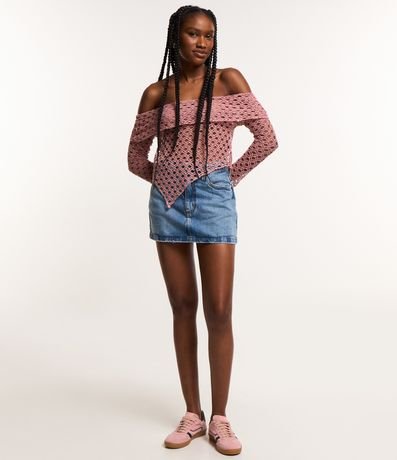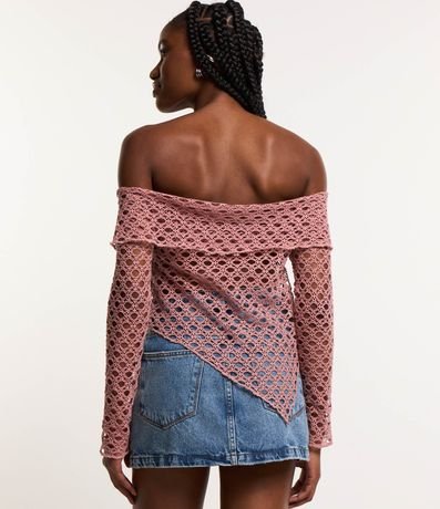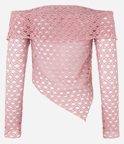Ref: Blusa feminina de modelo ombro a ombro, confeccionada em tela de algodão efeito crochê, com pala virada no decote, mangas longas e barra assimétrica de ponta.