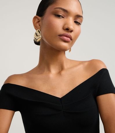 Ref: Blusa de decote ombro a ombro, confeccionada em tricô, com manhas curtas e franzidos no busto.