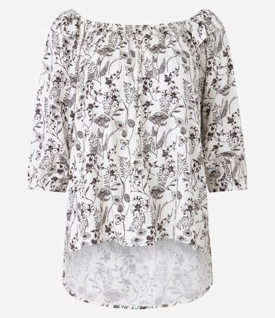 Blusa ombro a ombro feminina, confeccionada em viscolinho, com mangas longas e estampa raminhos de flores.
