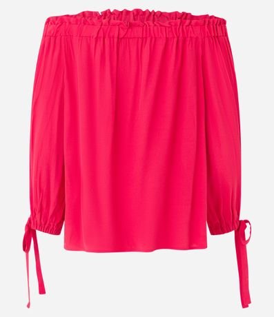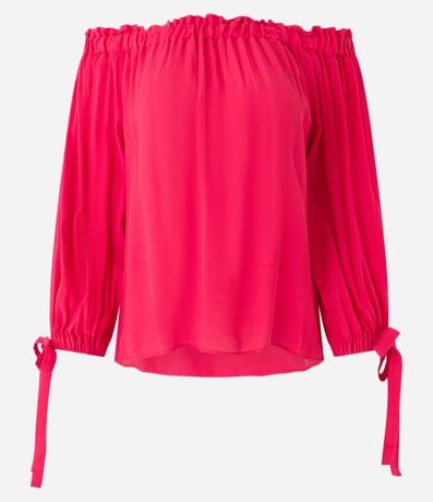 Ref: Blusa feminina ombro a ombro, com elástico no decote, mangas longas com amarração no punho e superfície sem estampa.