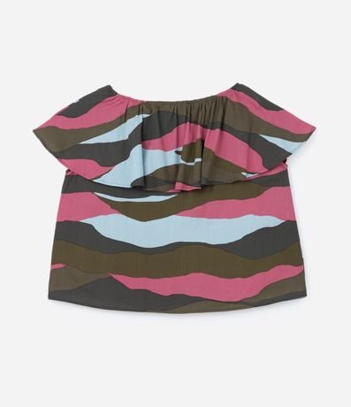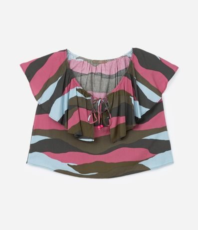 Blusa de viscose, com estampa abstrata e decote ombro a ombro com babado e amarração.