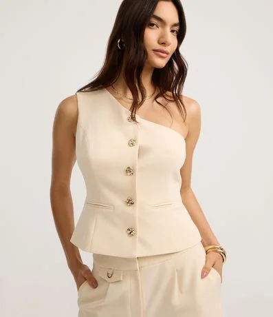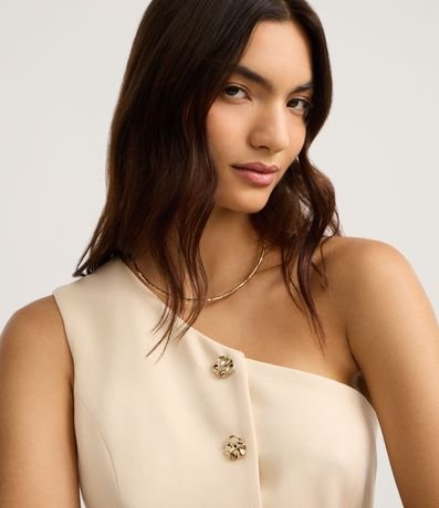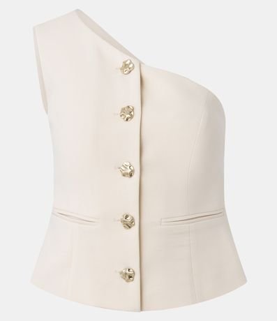 Blusa de decote ombro único, confeccionada em crepe, bolsos falsos, pences e botões metalizado com efeito martelado.