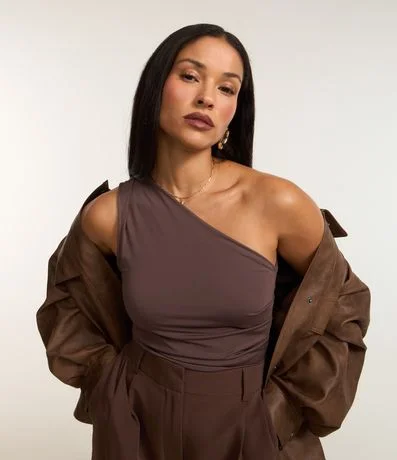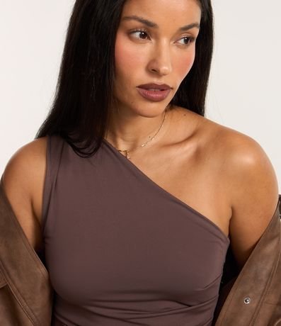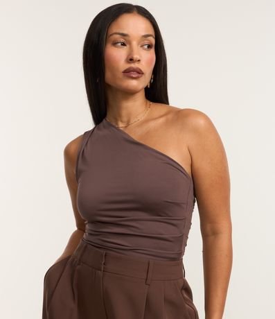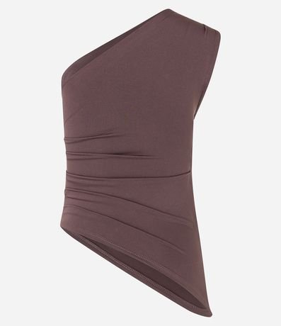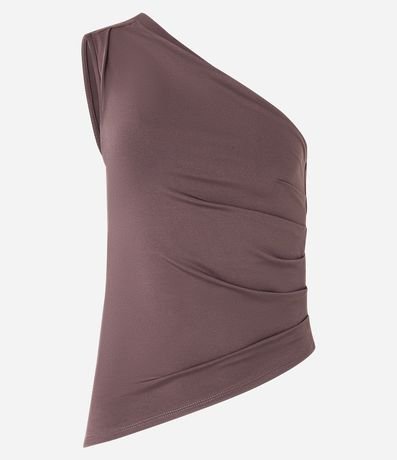 Blusa feminina confeccionada em malha jersey, com decote de ombro único e sem estampa. Possui franzidos na lateral e no ombro, e diferencial de barra assimétrica.