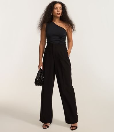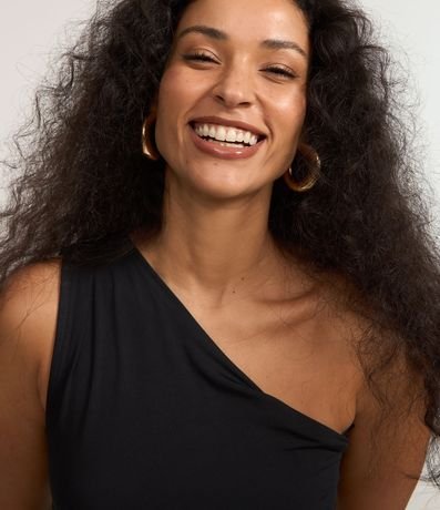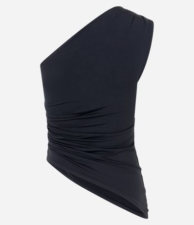 Blusa feminina confeccionada em malha jersey, com decote de ombro único e sem estampa. Possui franzidos na lateral e no ombro, e diferencial de barra assimétrica.