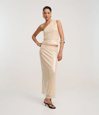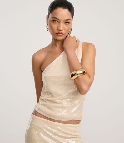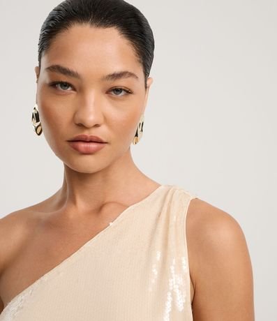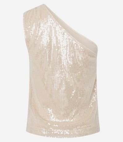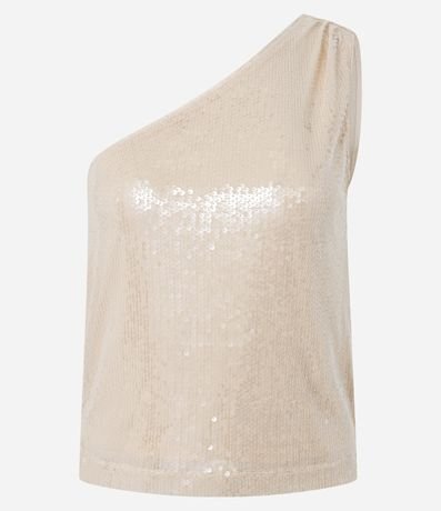 Ref: Blusa sem mangas, confeccionada em paetês, com decote ombro único e franzido na alça larga. Peça com paetês com transparência e forro.