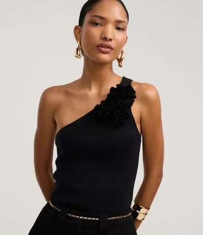 Ref: Blusa sem mangas, confeccionada em tricô, com decote ombro único, e flor de tecido aplicada no ombro. Este produto possui viscose certificada em sua composição, sendo ambientalmente mais responsável.