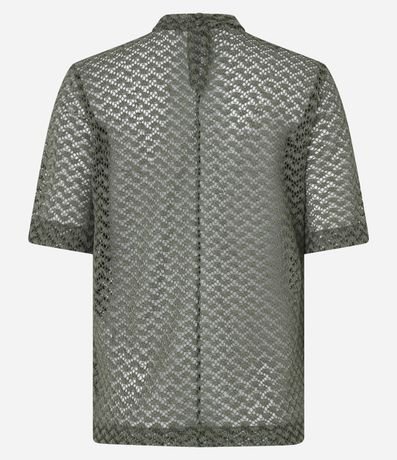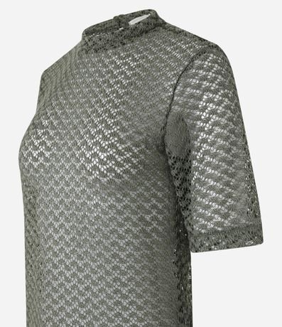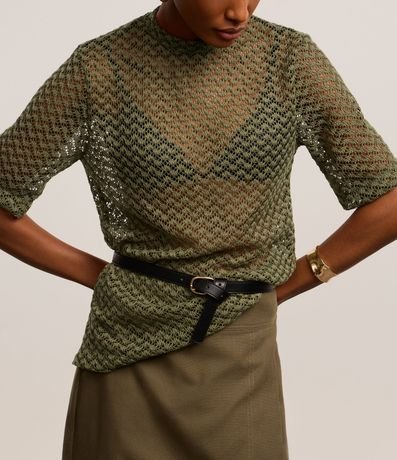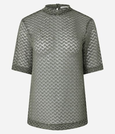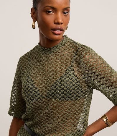 Ref: Blusa feminina de modelo over, confeccionada em tricô, com gola altinha e manga curta. A peça sem estampa é texturizada, possui transparência e abertura nas costas.