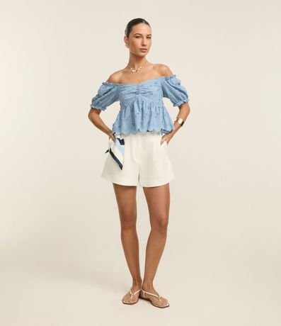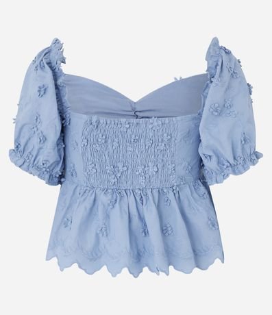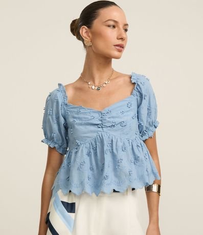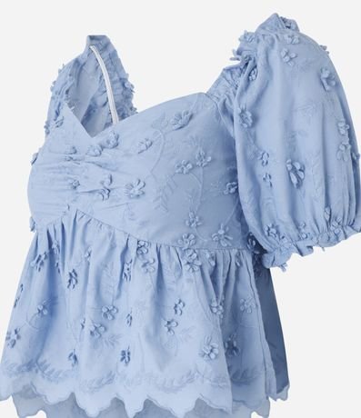 Blusa Peplum em Algodão com Bordado Floral e Manga Bufante