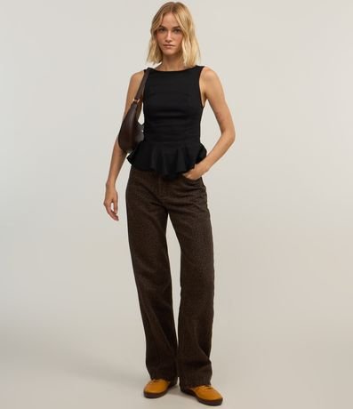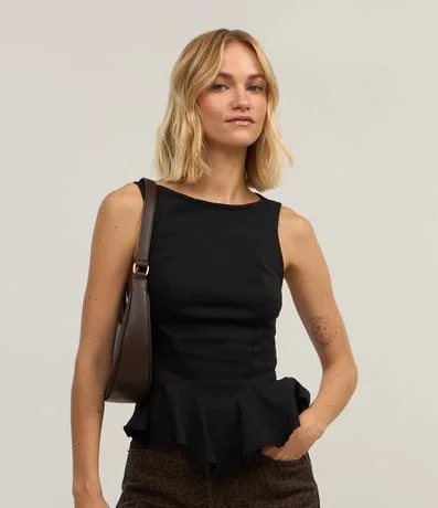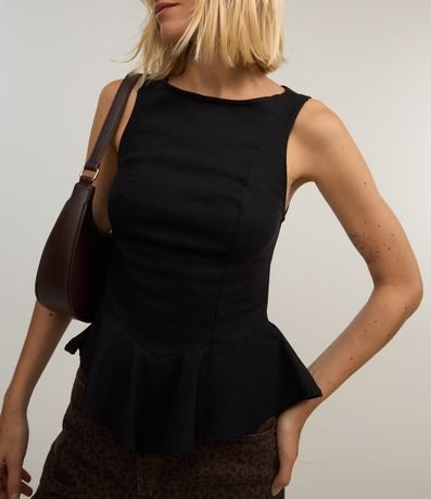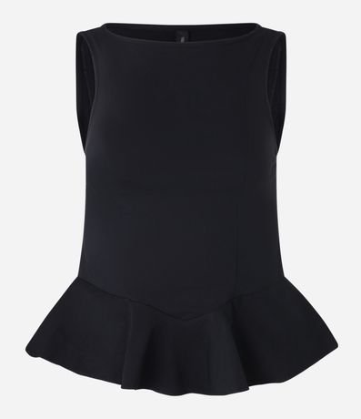 Blusa feminina de modelo peplum, confeccionada em bengaline, com gola redonda, sem mangas e sem estampa.