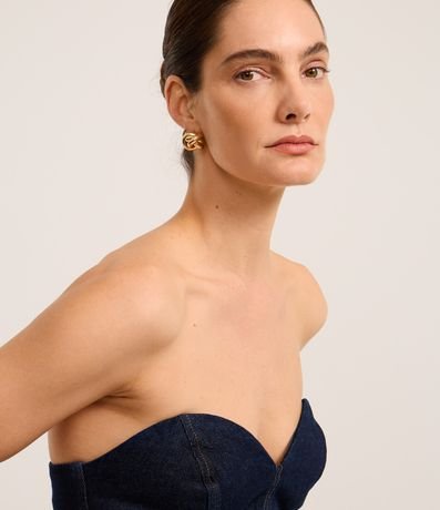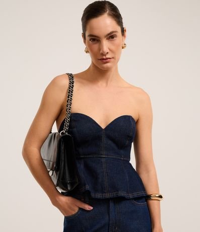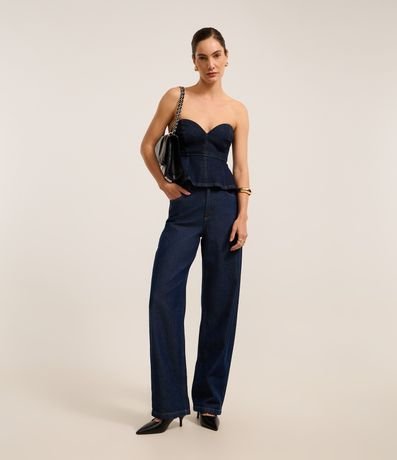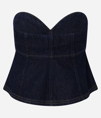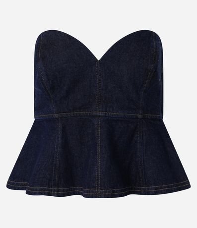 Ref: Blusa tomara que caia com decote coração, confeccionada em jeans com algodão bci mais sustentável, barra peplum e costura contrastante.