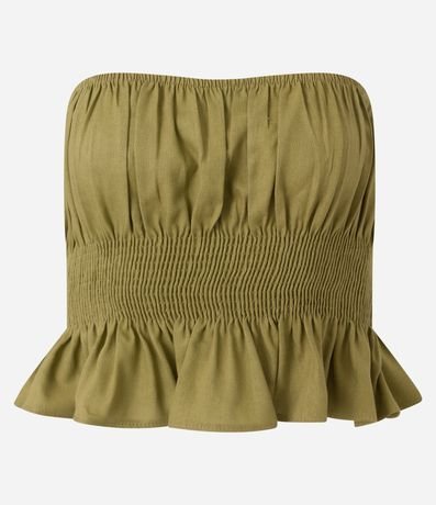 Ref: Blusa cropped peplum confeccionada em viscolinho, com decote reto e sem alça. Sem estampa, possui textura franzida e cintura ajustada em lastex.