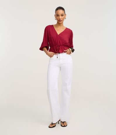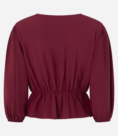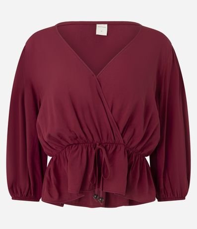 Ref: Blusa peplum, confeccionada em viscose, com decote V transpassado, mangas curtas com elásticos nos punhos e amarração na cintura. Este produto possui material mais sustentável em sua composição, sendo ambientalmente mais responsável.