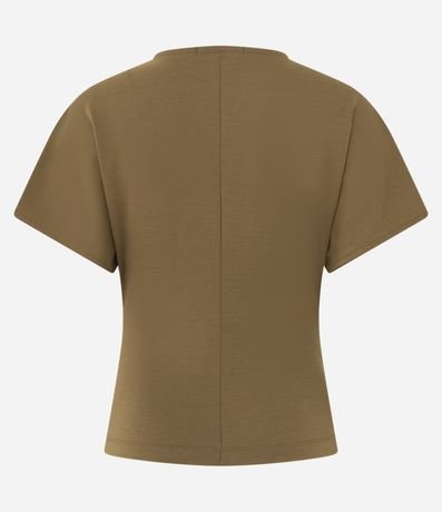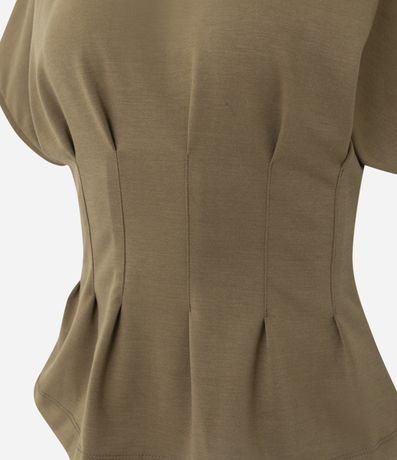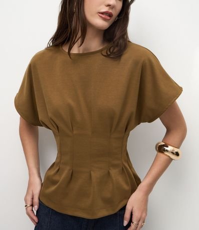 Ref: Blusa feminina em poliéster com modelagem peplum. Possui pregas frontais, decote redondo e mangas curtas com caimento reto.