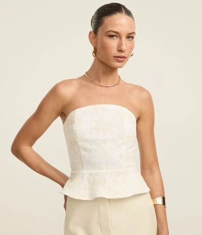 Ref: Blusa peplum sem alças com decote reto e forro. A peça não tem mangas e conta ainda com bordados florais.