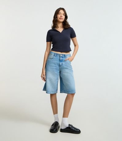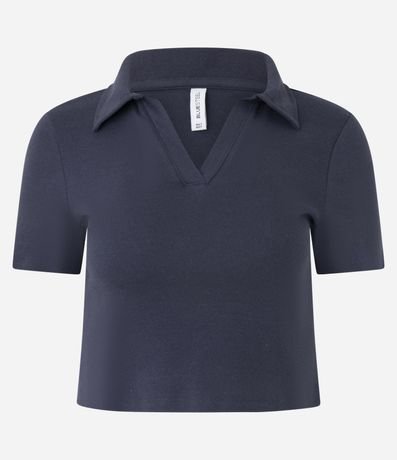 Ref: Blusa feminina polo alongada em ribana de algodão certificado bci com boas práticas ambientais, gola em v, manga curta.