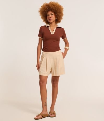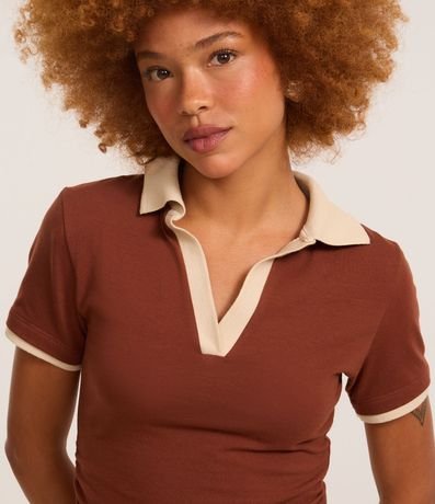 Blusa Polo em Cotton com Gola Contrastante e Franzido Lateral