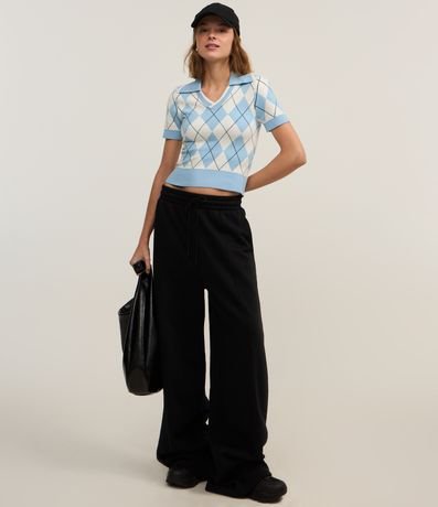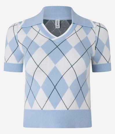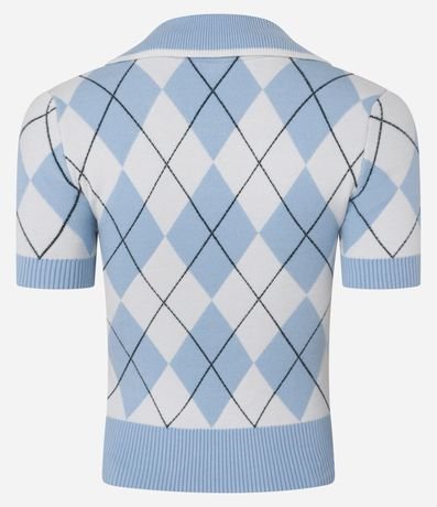 Ref: Blusa polo feminina, confeccionada em jacquard, com lapela na gola e mangas curtas. A peça também conta com detalhes nas mangas e estampa geométrica.